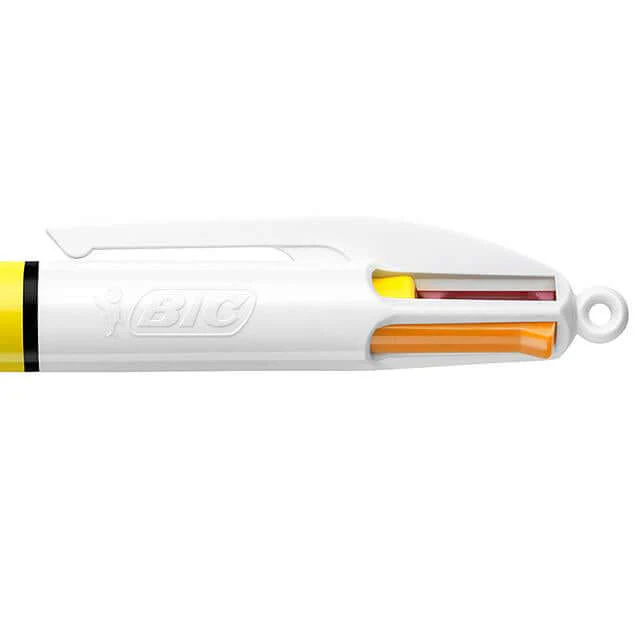 BIC's 4-Colour Multipen ballpoint is a classic. You get 4 colours - in this case, violet, pink, orange and yellow - in one pen. All you need do is push down the side button for the colour you want, and retract it by pushing down any of the other buttons. It has a handy pocket clip and a little ring on the end, just in case you need to attach it to something.