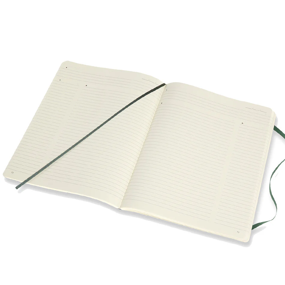 Moleskine Extra Large Pro Notebook with flexible green cover and robust rounded corners. Expandable inner pocket that contains the history of Moleskine and stickers for labelling, and is perfect for storing receipts, tickets and loose notes. Black elastic closure and fabric page marker.